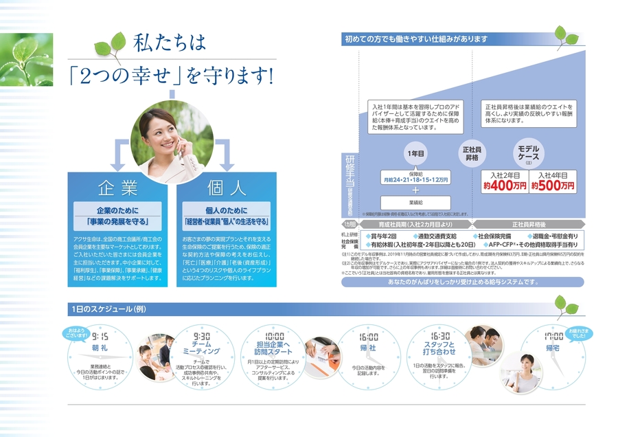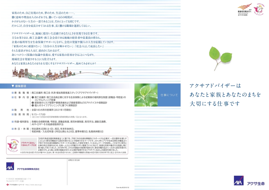 商工会議所 共済・福祉制度推進スタッフ(アクサアドバイザー)は、地域に根付いた活動であなたらしさを実現できる仕事です。企業の福利厚生を生命保険でサポートしながら、会社の発展や個人の人生を応援していきます。